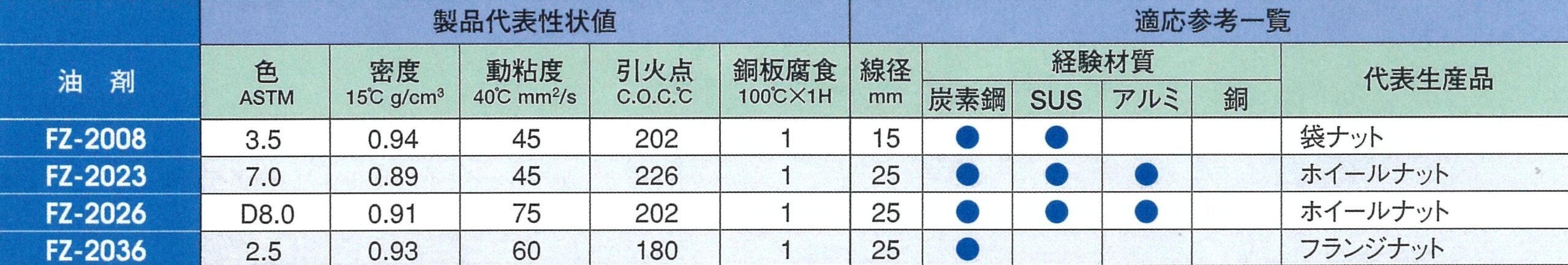 圧造加工 FZ-2000 シリーズ(ナット加工用) この記事のタイトルとURLをコピーする 特徴 近年増え続けている「ナット加工の高速化」、複合的な「押出し」加工に適した油剤です。 用途 主にナット加工用 製品代表性状値/適応参考一覧 FZ-3000 シリーズ(大パーツ加工用) 前の記事 RMシリーズ(一般ゴム用) 次の記事