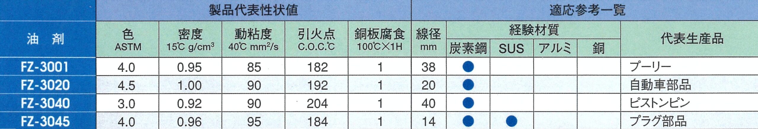 センターオイル FZ-3000 シリーズ(大パーツ加工用) この記事のタイトルとURLをコピーする 特徴 近年ますます大型化される冷間鍛造品の加工性はもちろんのこと、耐熱性などに対応した大型パーツフォーマー用油剤です。 用途 主に大パーツ加工用 製品代表性状値/適応参考一覧 FZ-4000 シリーズ(中パーツ加工用) 前の記事 FZ-2000 シリーズ(ナット加工用) 次の記事