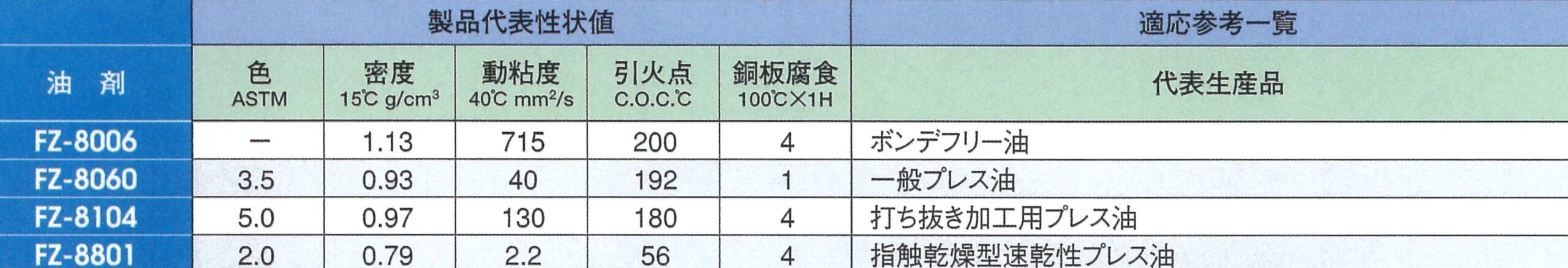 金属加工油 FZ-8000 シリーズ(板金プレス加工用) この記事のタイトルとURLをコピーする 特徴 ファインブランキング、ボンデフリー、速乾性を求めるプレス加工に対応した製品群を揃えた縦型プレス用油剤です。 用途 主にプレス加工用 製品代表性状値/適応参考一覧 FZ-5000 シリーズ(小パーツ加工用) 次の記事