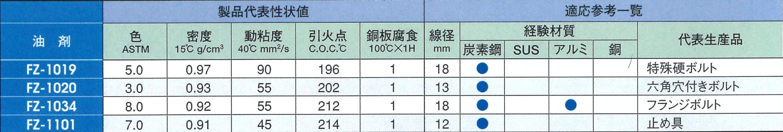 センターオイル FZ-1000 シリーズ(ボルト加工用) この記事のタイトルとURLをコピーする 特徴 ボルト加工の主となる「軸絞り」「据え込み」「トリミング」の工程において効果を発揮する油剤です。 用途 主にボルト加工用 製品代表性状値/適応参考一覧 センターコート(コンクリート剥離用) 前の記事 ペリコーティングB(バス用コーティング剤) 次の記事